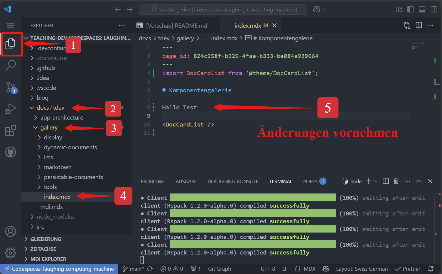 - Im Codespace können nun Änderungen an der Webseite vorgenommen werden.